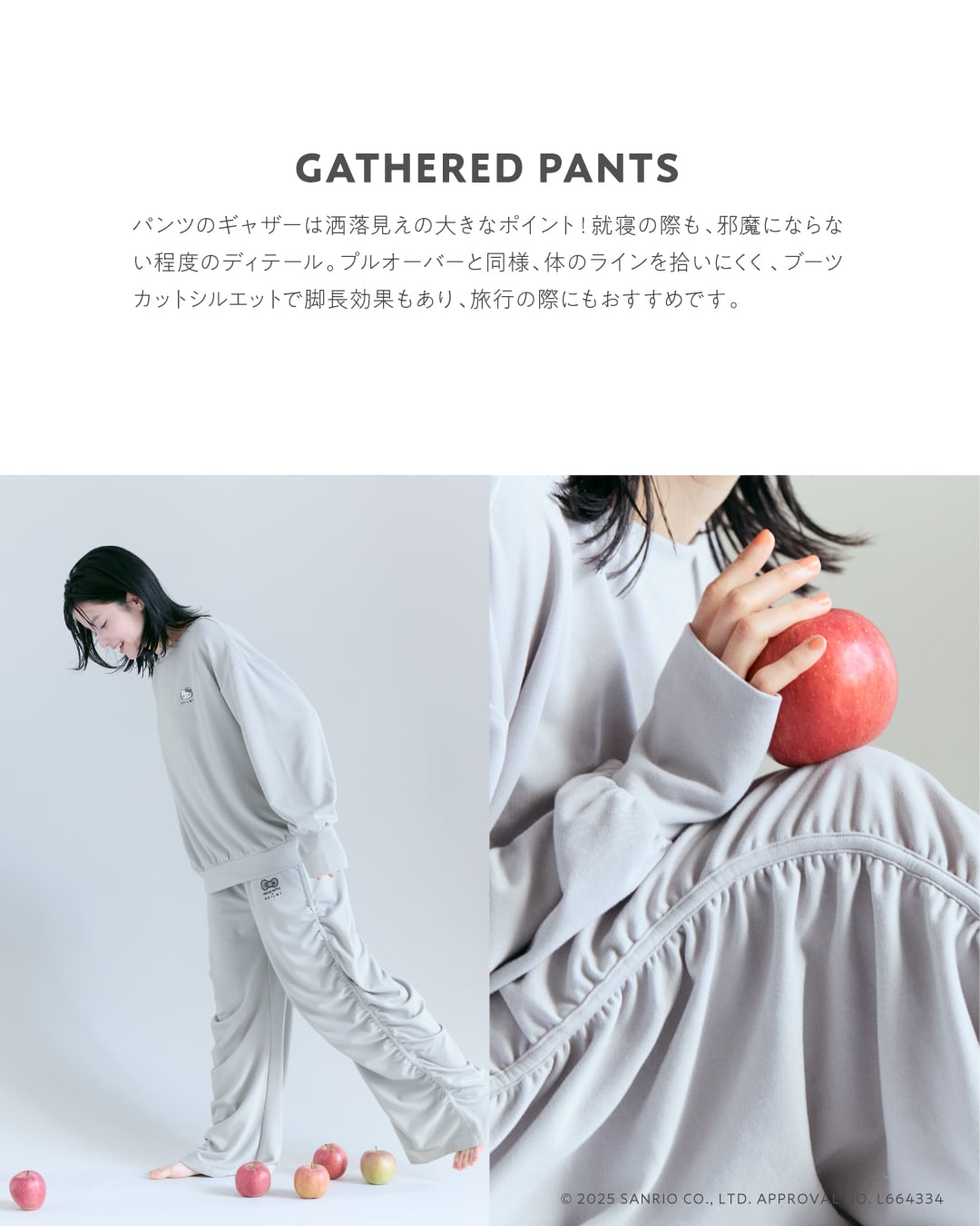 パンツのギャザーは洒落見えの大きなポイント!就寝の際も邪魔にならない程度のディテールです。プルオーバーと同様、体のラインを拾いにくく、ブーツカットシルエットで脚長効果もあり、旅行の際にもおすすめです。