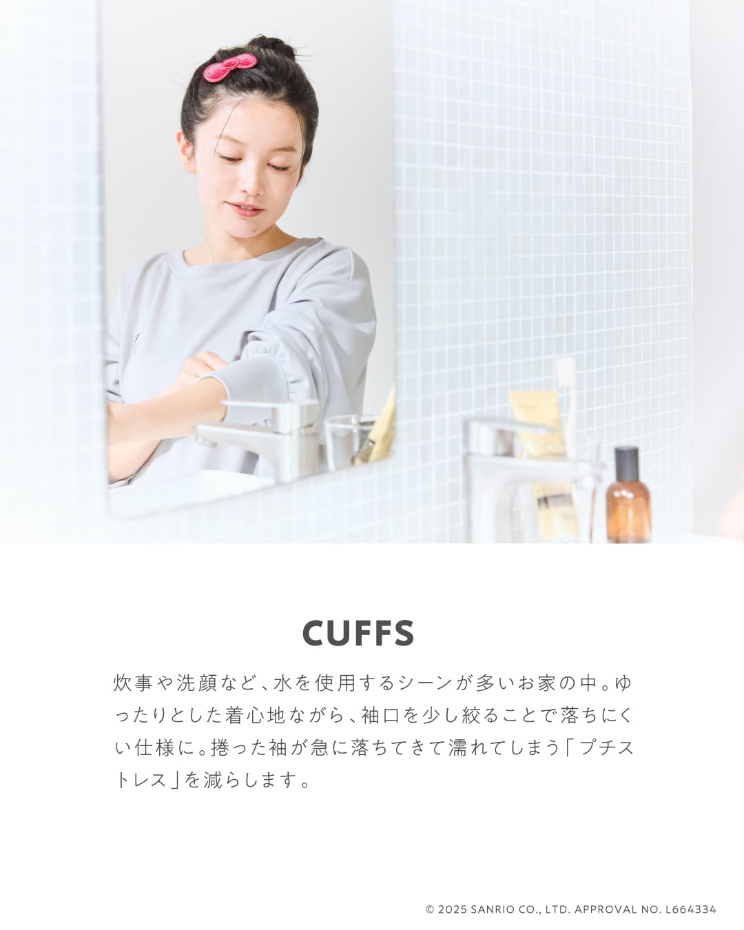 炊事や洗顔など、水を使用するシーンが多いお家の中。ゆったりとした着心地ながら、袖口を少し絞ることで落ちにくい仕様に。捲った袖が急に落ちてきて濡れてしまう「プチストレス」を減らします。