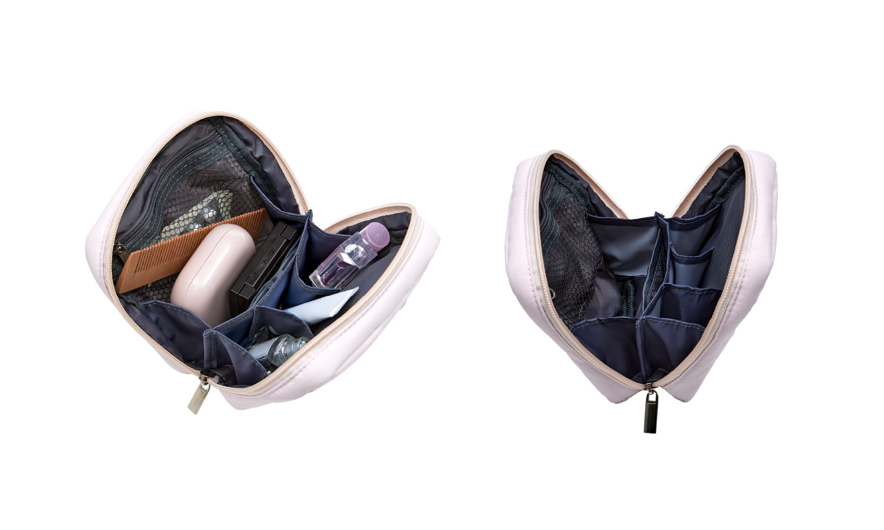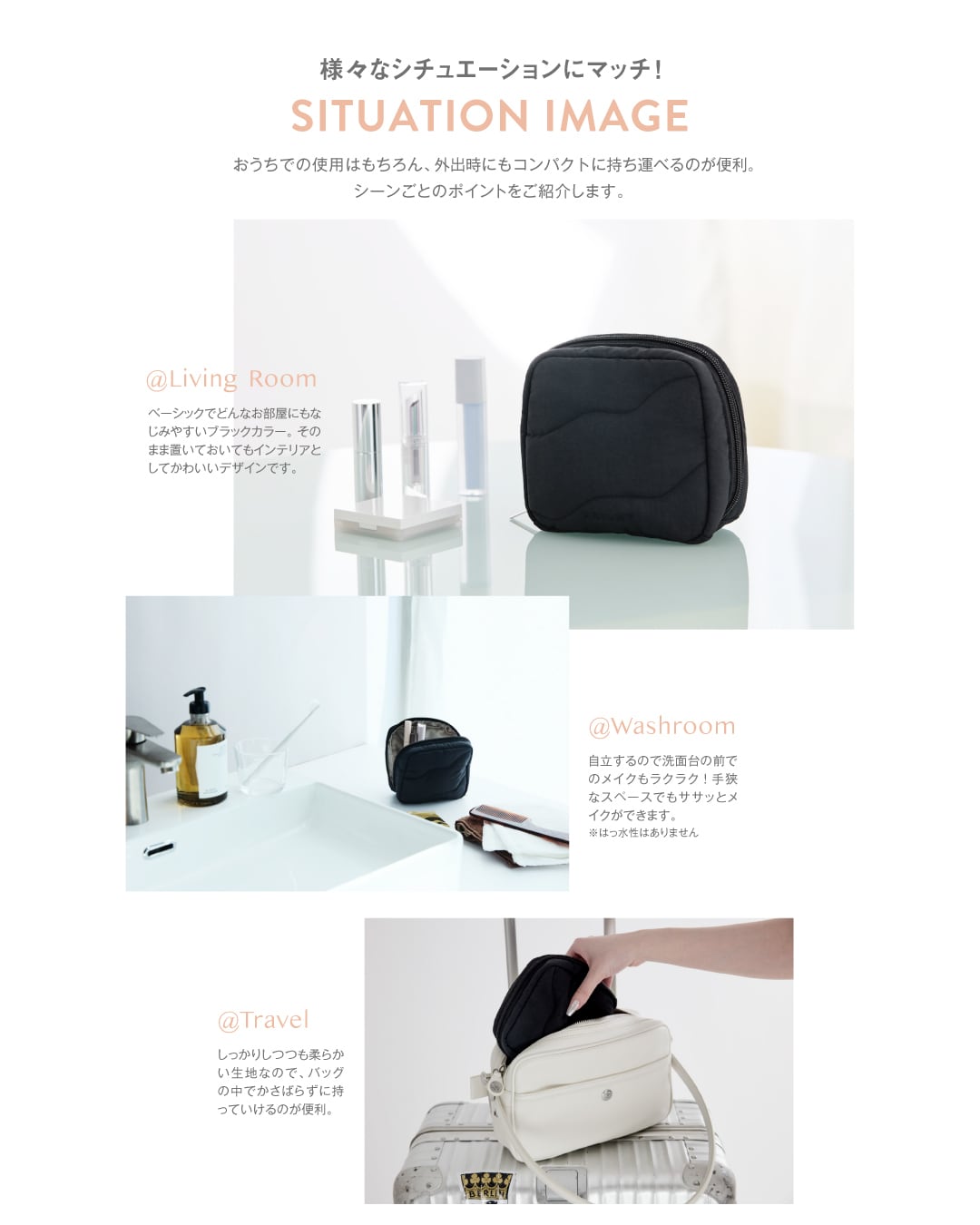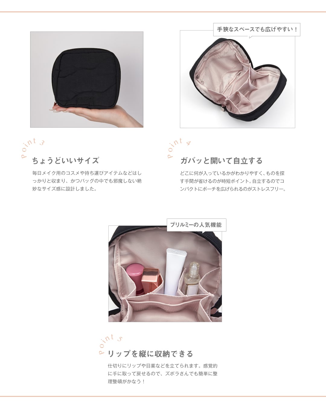 毎日メイク用のコスメや持ち運びアイテムなどはしっかりと収まり、かつバッグの中でも邪魔しない絶妙なサイズ感に設計しました。