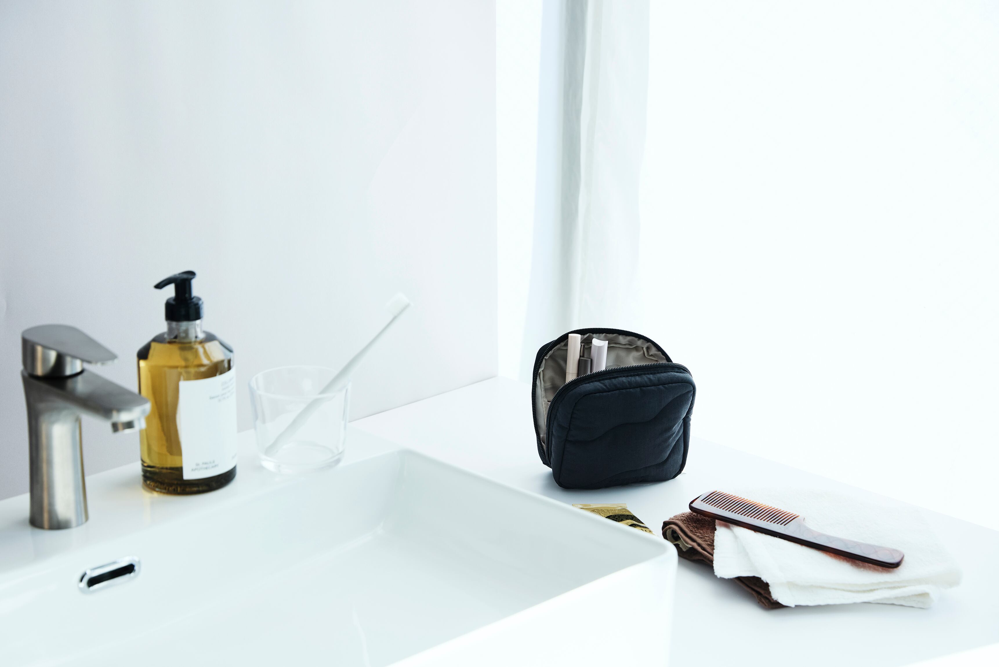 自立するので洗面台の前でのメイクもラクラク!手狭なスペースでもササッとメイクができます。