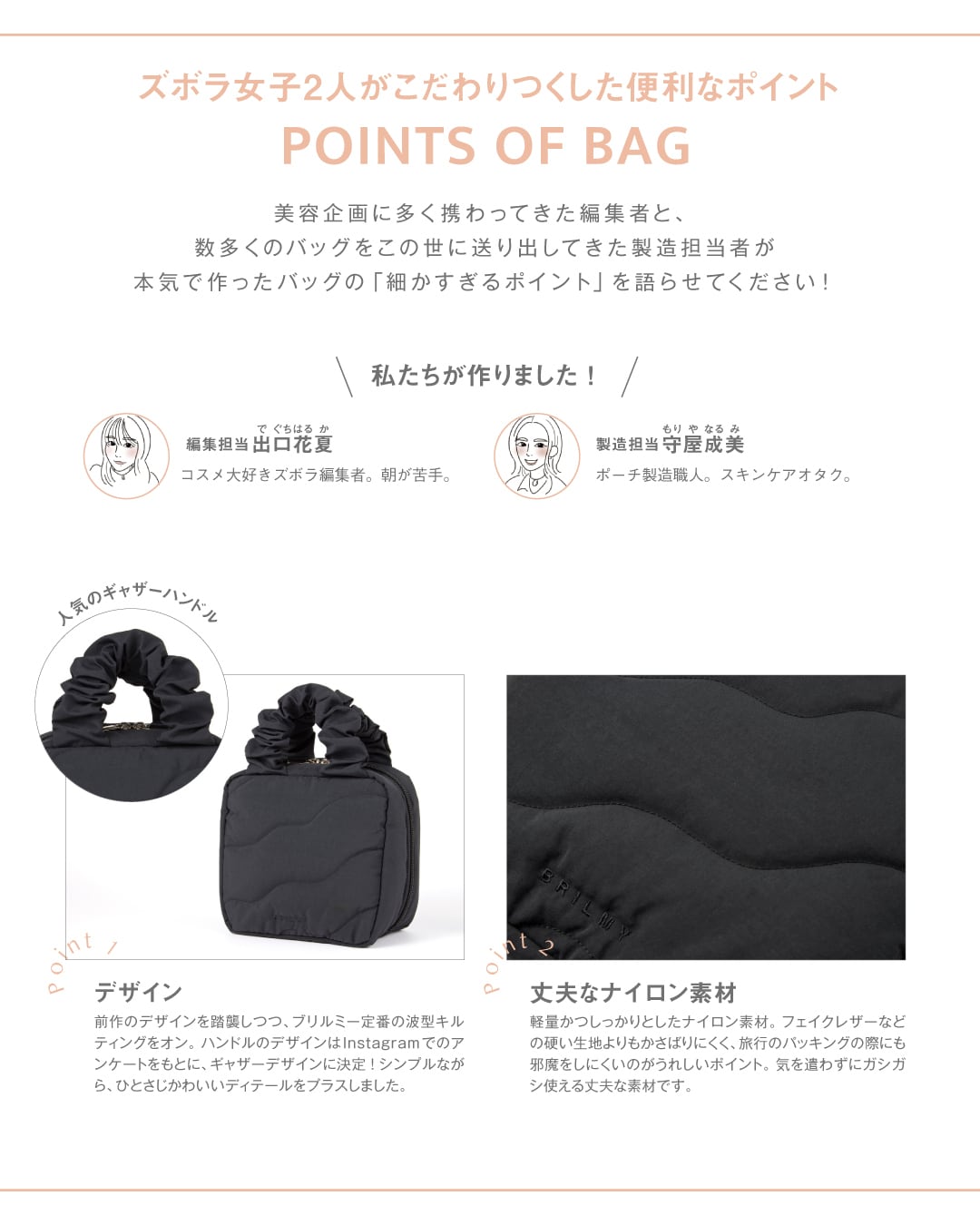前作のデザインを踏襲しつつ、ブリルミー定番の波型キルティングをオン。ハンドルのデザインはInstagramでのアンケートをもとに、ギャザーデザインに決定!シンプルながら、ひとさじかわいいディテールをプラスしました。