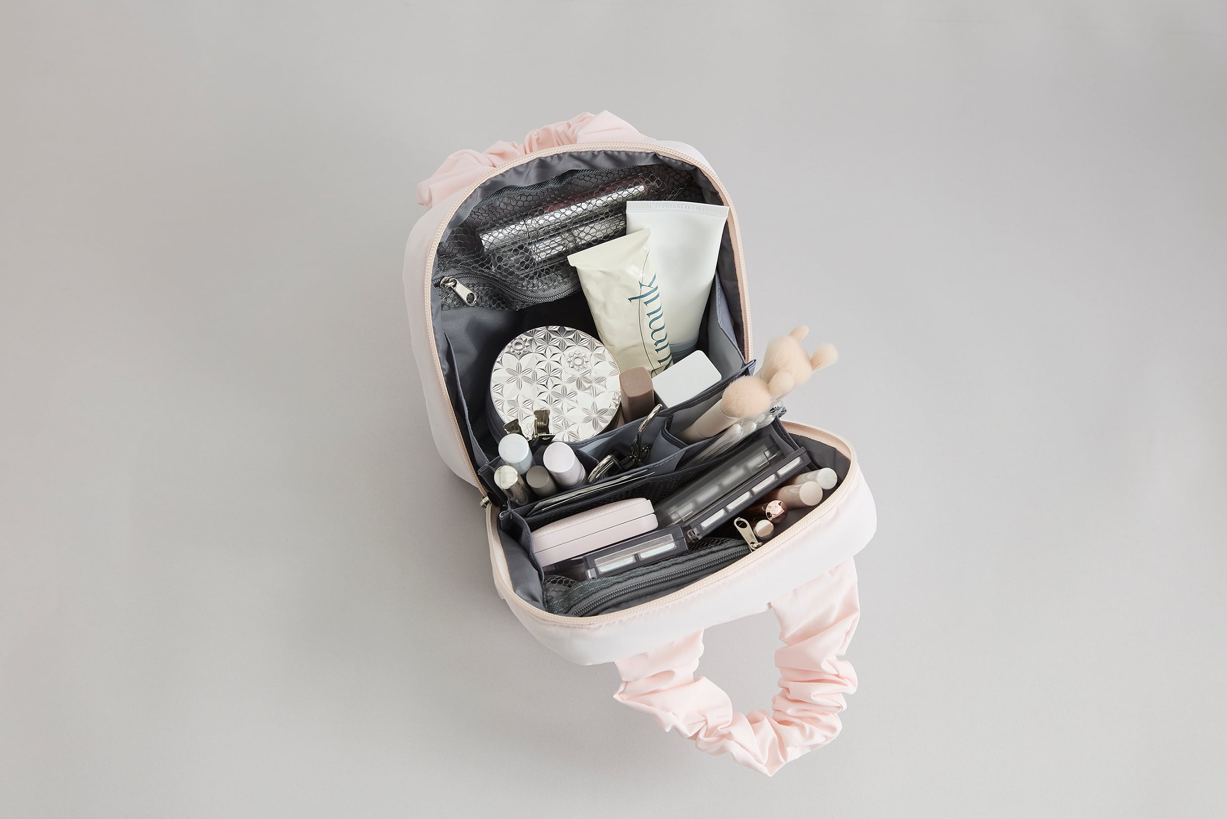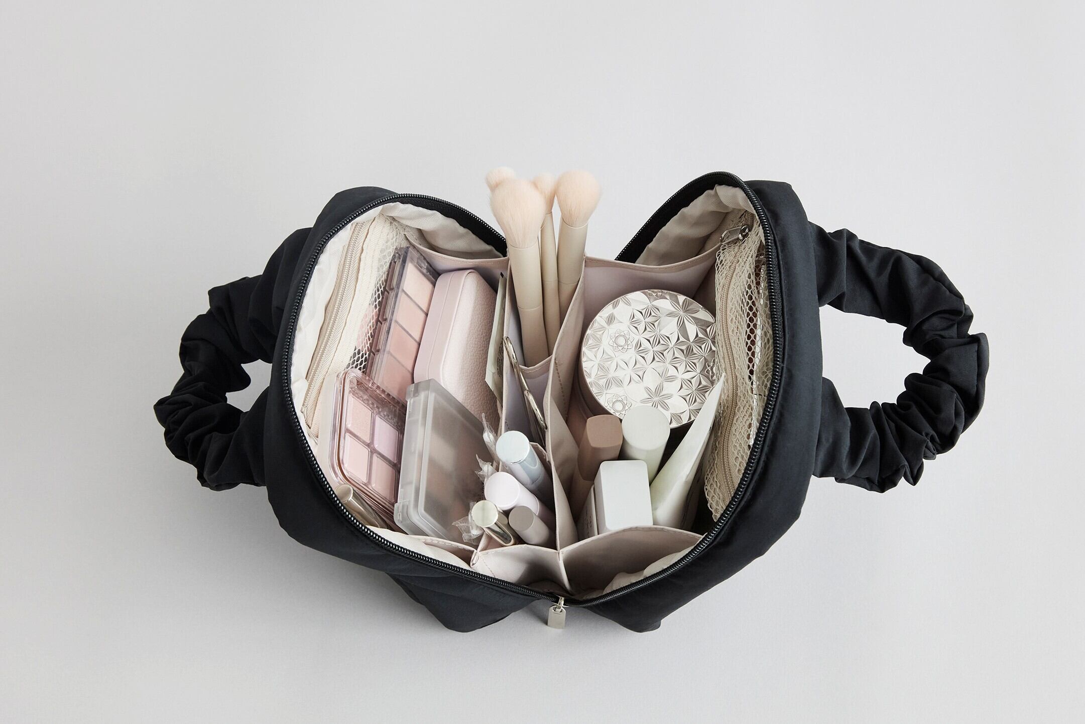 どこに何が収納されているかがひと目でわかりやすく、コスメを探す手間が省けるのが最大の時短ポイント。また、自立するのでコンパクトにポーチを広げられ、手狭なスペースでもストレスフリーにメイクができます。