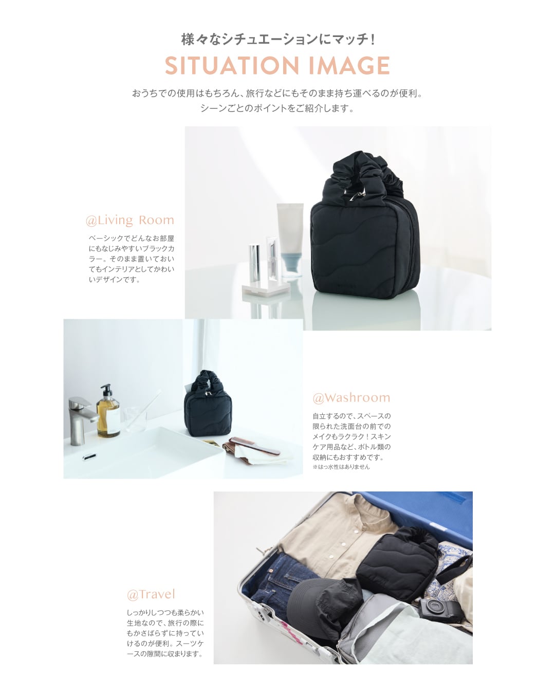 今回の最大のブラッシュアップポイント!以前から希望をいただいていたバックポケットが新たにつきました。ミラーやフェイスパックなど、意外と美容周りに多い幅広アイテムの収納に便利。